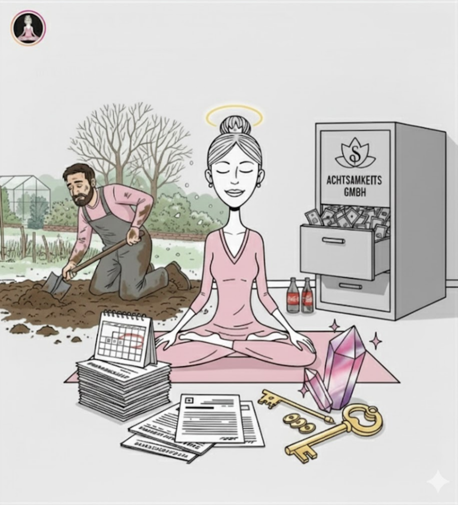 Es ist eine faszinierende spirituelle Gabe, Dankbarkeit zu “kultivieren”, ohne jemals das Wort DANKE an den Menschen zu richten, der die Schaufel in der Hand hielt. In der Achtsamkeits GmbH feiern wir das Innehalten, während wir die Spuren derer, die für uns geschuftet haben, einfach aus dem Bild retuschieren. 🧘♀️✨