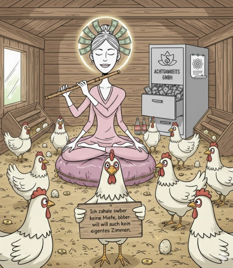 In der Achtsamkeits GmbH haben wir die nächste Stufe der „emotionalen Entlastung“ erreicht: Die Hühnerstall-Philosophie. Es ist die radikalste Form der Co-Regulation, denn unsere gefiederten Freunde wissen intuitiv: Meine Bedürfnisse kommen zuerst.